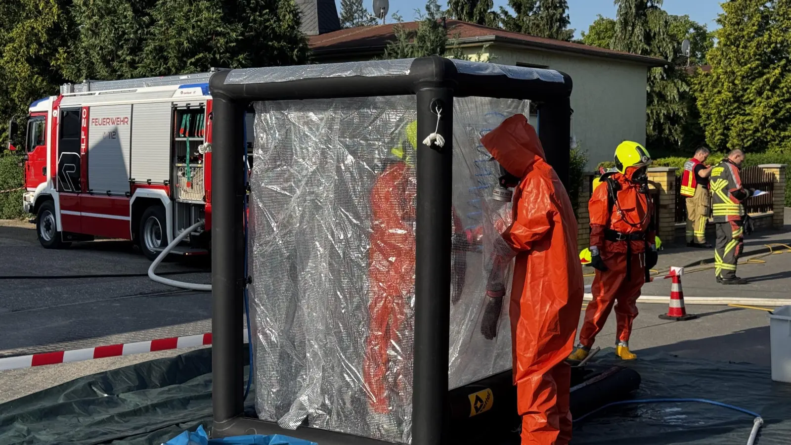 Die Szenerie vor Ort ließ auf die Ernsthaftigkeit des Vorfalls schließen: Zahlreiche Feuerwehrleute in Vollschutzanzügen sicherten das Gelände. Eine Dekontaminationsstelle („Dekon-Platz“) wurde direkt vor dem betroffenen Bereich eingerichtet – deutlich gekennzeichnet und abgeschirmt. Dort durchliefen die Einsatzkräfte nach dem Kontakt mit dem Gefahrstoff eine gründliche Reinigung. Das Gelände wurde weiträumig abgesperrt, Hinweisschilder wie „Zutritt verboten“ machten Unbeteiligte auf das Risiko aufmerksam. Weitere Kräfte überwachten in sicherer Entfernung den Ablauf, während die Dekon-Einheit systematisch die Schutzanzüge reinigte und sicherte.